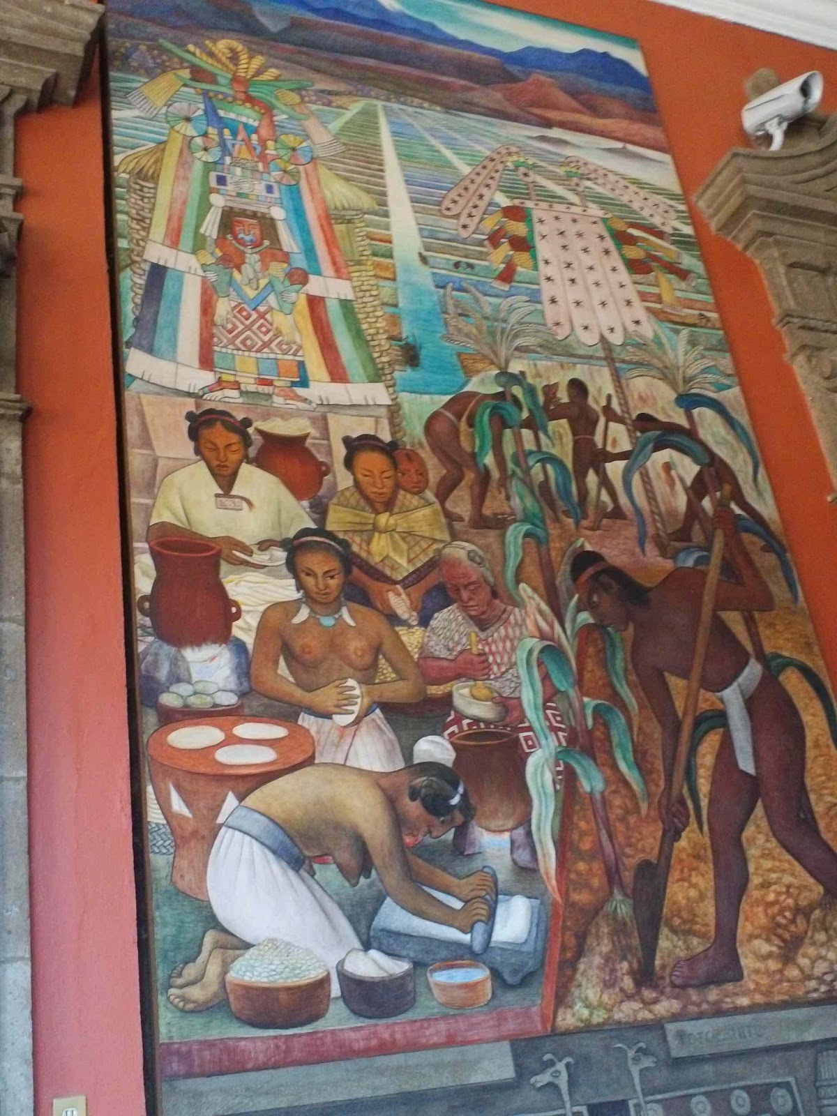 Next, we went into the National Palace. We were caught with pens and had to put them back in the lockers. Contraband! I could see why, as Diego Rivera’s murals were close enough to touch. It would be a shame to have some crazy person augment them. The most impressive thing to me was that Rivera’s paintings depicting the history of Mexico included his political opinions that were not always complimentary of the government. Accolades to Mexican politicians! There was so much to see in the paintings: the agriculture and religion of the ancient people, the various wars and conflicts, the progression of the religious evolutions and political revolutions and a little portrait of Frida and family. There were other paintings depicting how old cultures did their art, sold wares, kept their animals and others.